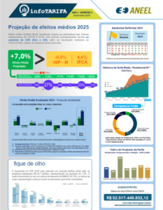 A Agência Nacional de Energia Elétrica (ANEEL), lançou em abril de 2025 o InfoTarifa. Logo, o InfoTarifa é um boletim trimestral que detalha a evolução histórica e os principais impactos em cada componente das tarifas. Além disso, apresenta o panorama dos processos em andamento e de fatores que influenciam nos cálculos realizados pela Agência, como os encargos setoriais.