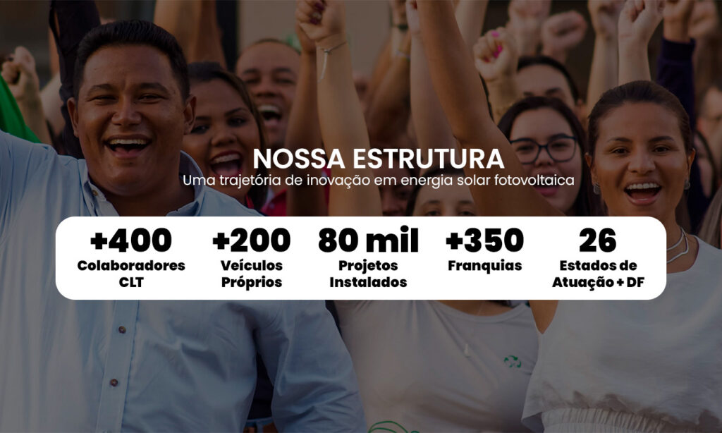 A empresa, ao todo, efetivou cerca de 80.000 projetos e atua diretamente nos 26 estados do Brasil, mais o Distrito Federal. Energia solar que é renovável, limpa e infinita. A nossa principal referência no mercado, é a satisfação dos mais diversos clientes. Além de dar seu livre depoimento nas redes sociais da empresa, indicam a familiares e amigos. É a segurança de um preço justo, segurança na qualidade do material utilizado, segurança na prestação de serviço de nossos instaladores. Mas, principalmente, segurança em uma empresa idônea.