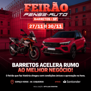 Barretos sediará no próximo final de semana (27 a 30 de novembro) o Feirão Pense Auto. Com o apoio do Santander, o feirão promete revolucionar a mobilidade urbana em Barretos e região, com carros e motos em condições únicas. O local do evento é o Espaço Verde na Avenida dos Coqueiros, contará com mais de 20 lojistas e terá seu início à partir de 9h.