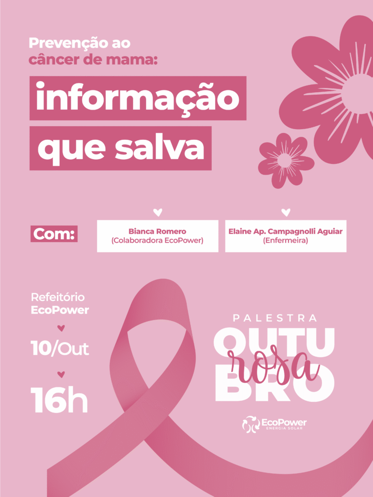 A EcoPower Eficiência Energética, promoverá nesta sexta (10/10), palestra sobre o “Outubro Rosa” aos seus colaboradores. A empresa conta com mais de 400 colaboradores em sua sede.
